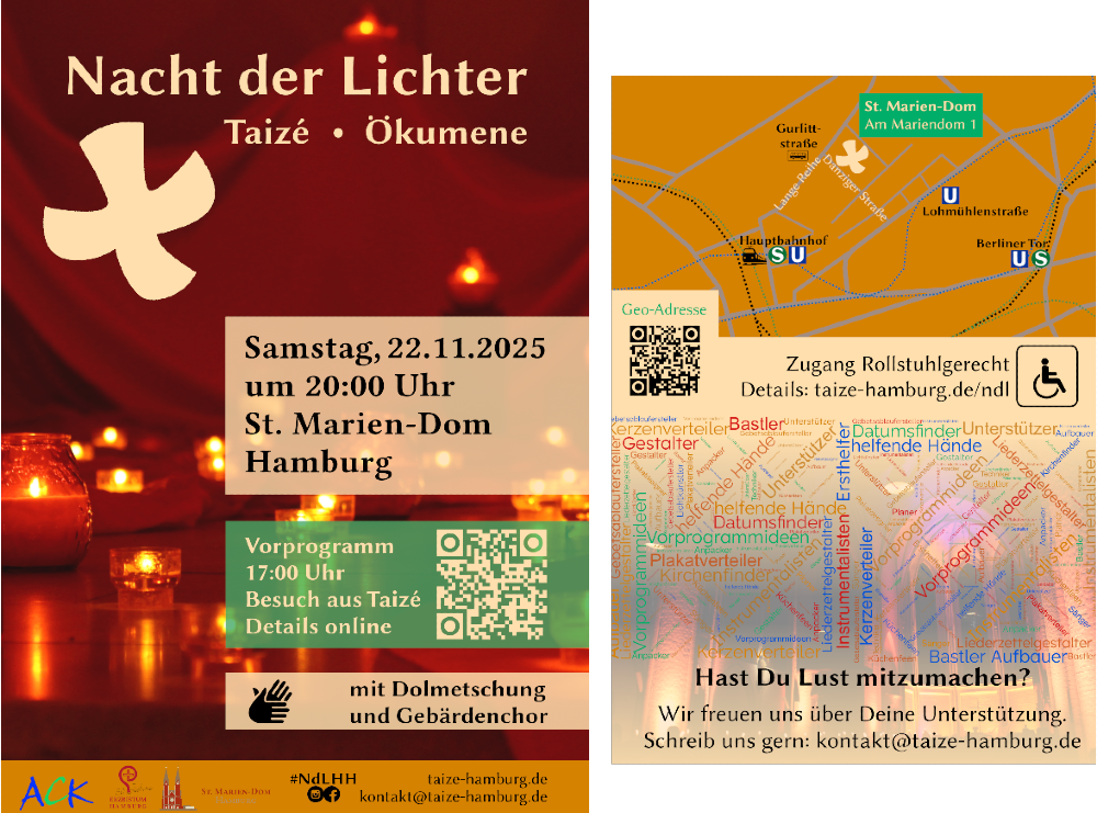Już 22 listopada 2025 r. o godz. 20:00 odbędzie się spotkanie w duchu Taizé w Katedrze Mariackiej (St. Mariendom) w Hamburgu. Zapraszamy do przeżycia niezwykłego wieczoru modlitwy światłem i śpiewem (Nacht der Lichter). W spotkaniu weźmie udział brat z Taizé oraz arcybiskup Hamburga! Spotkanie jest organizowane w języku niemieckim.