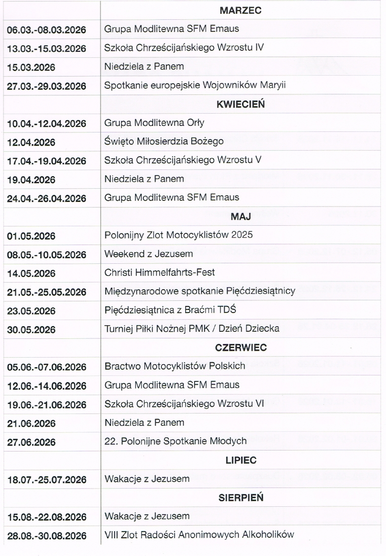 - Formacja duchowa: Miejsce organizacji ogólnokrajowych rekolekcji, dni skupienia dla grup parafialnych, wspólnot oraz spotkań dla małżeństw i rodzin.
