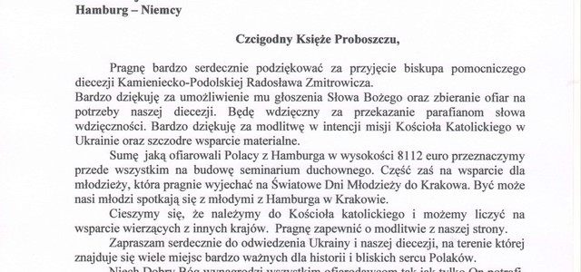 Ksiądz Biskup Diecezjalny w Kamieńcu Podolskim przesłał naszej Misji podziękowanie za umożliwienie głoszenia Słowa Bożego i zbierania ofiar przez Ks. bpa Radosława Zmitrowicza.
